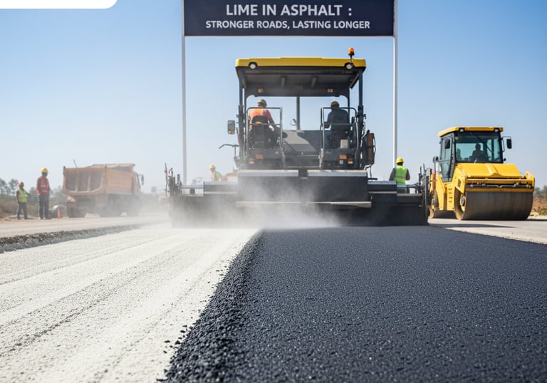 Lime application in asphalt improves pavement durability by enhancing adhesion between bitumen and aggregates. Lime reduces moisture damage, prevents stripping, increases resistance to cracking, and extends road life, making it a cost-effective and sustainable solution for high-performance asphalt pavements.